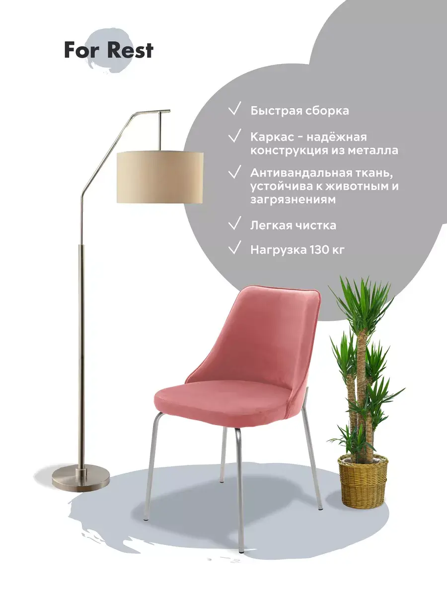 Мягкие и удобные стулья для кухни, кафе или салона красоты! Отличное решение в детскую комнату для школьника. Металлический каркас из толстостенного металла надежно прослужит в эксплуатации, мебельный мягкий антивандальный велюр отлично моется едва влажной тряпочкой.
