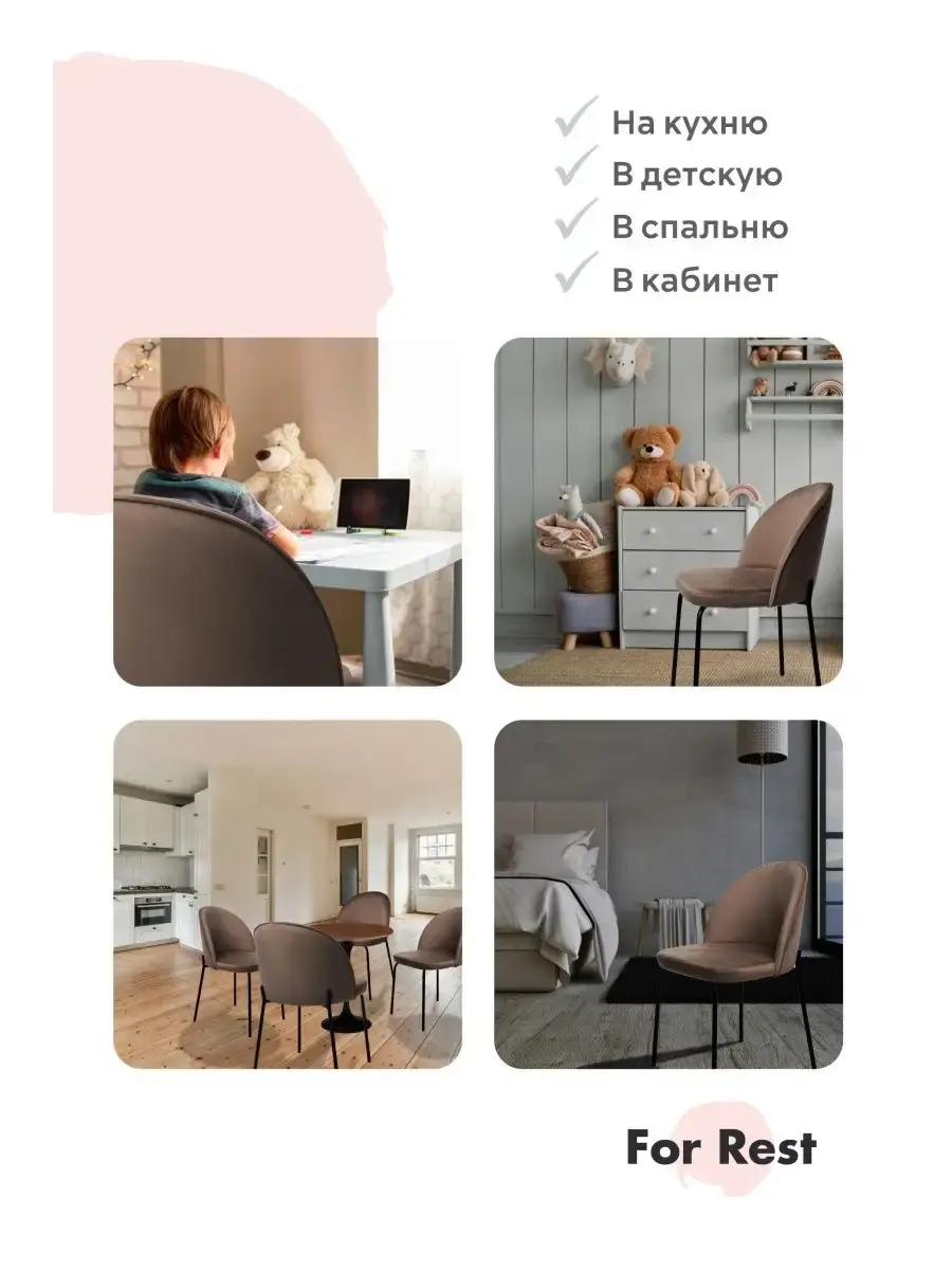 • Наши стулья будут идеально смотреться как с обеденным столом, так и с туалетным столиком. Прекрасно впишутся в интерьер жилой комнаты за письменным столом школьника, в детскую комнату, подойдут в интерьер салона красоты, конференц-зал, офис, в зал ресторана, кафе, бара или в зону ожидания клиентов.